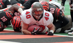 CINCINNATI, OH – DECEMBER 27: Fullback Mike Alstott #40 of the Tampa Bay Buccaneers gets tackled in the end zone for a touchdown against the Cincinnati Bengals at Cinergy Field on December 27, 1998 in Cincinnati, Ohio. The Buccaneers won 35-0. (photo by Robert Rogers/Tampa Bay Buccaneers)