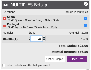 WORLD CUP DOUBLE: MULTIMAN recommends a BETDAQ MULTIPLES World Cup double on Monday paying around 2.26.